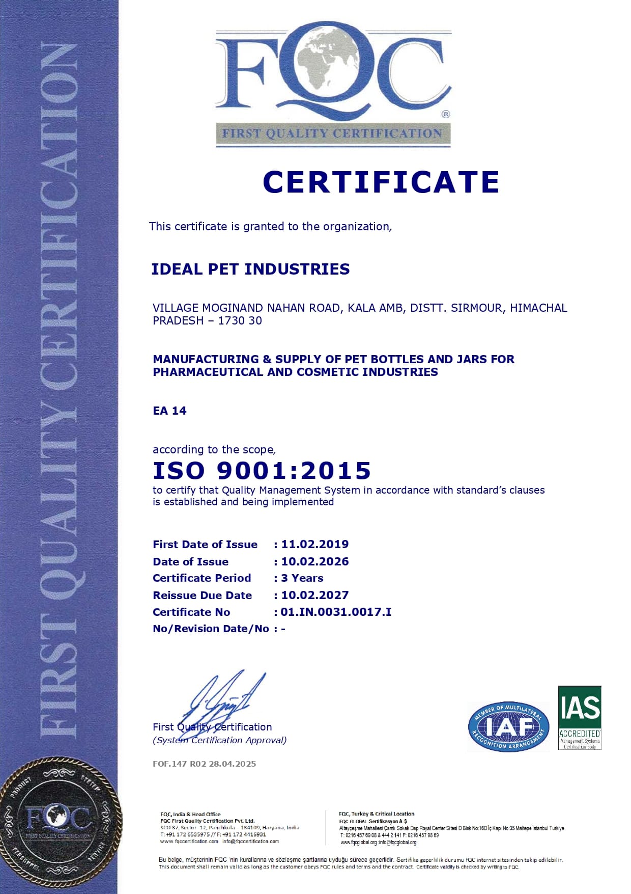 - To ensure that through established standards and measures, the level at IDEAL PET industries exceeds the expectations of our customers.